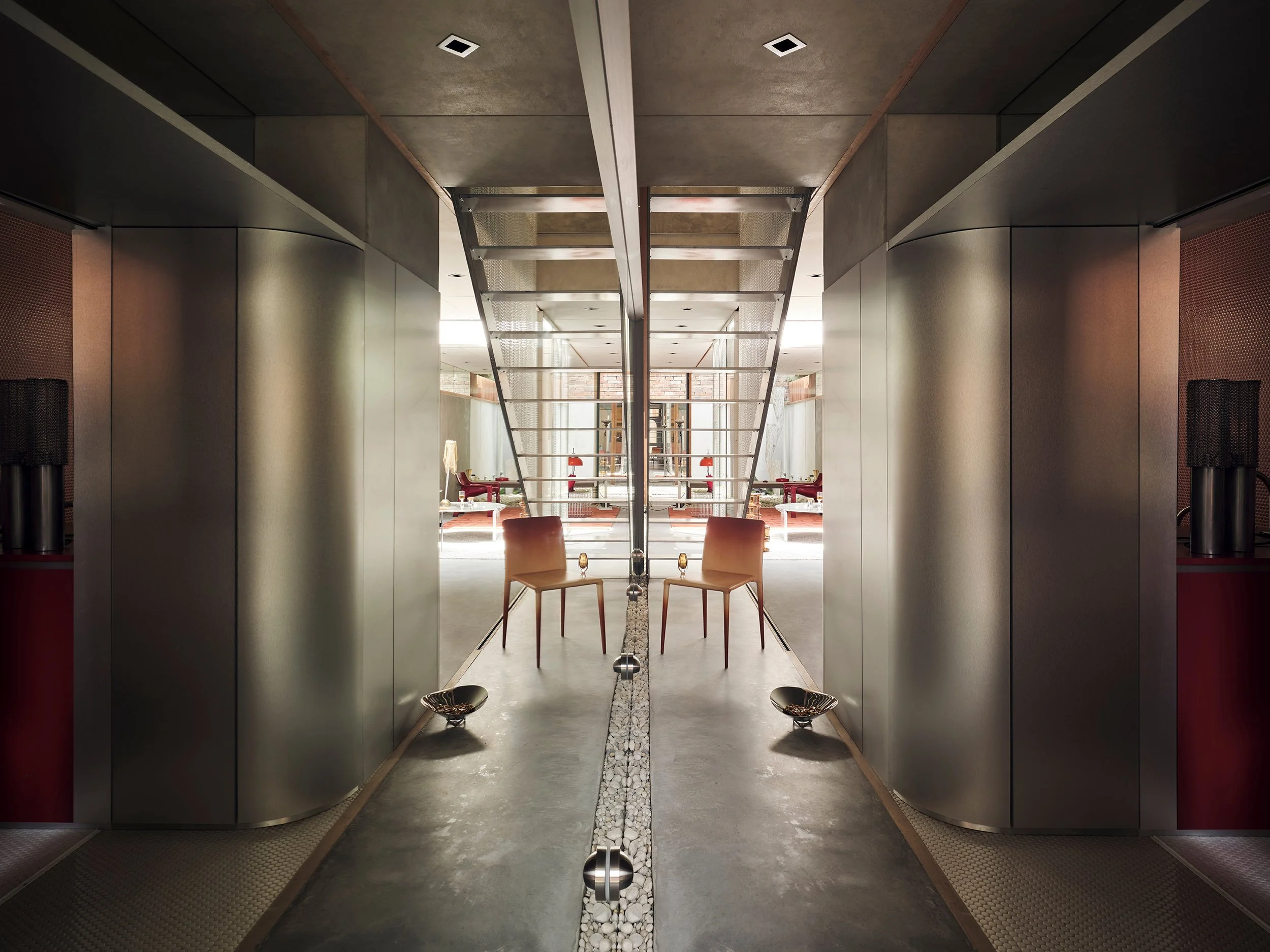 One of them is the elimination of corners to magnify the perception of space. In this pursuit, the elevated mirrors, partly inspired by the American Bar of Adolf Loos, are one such correction.