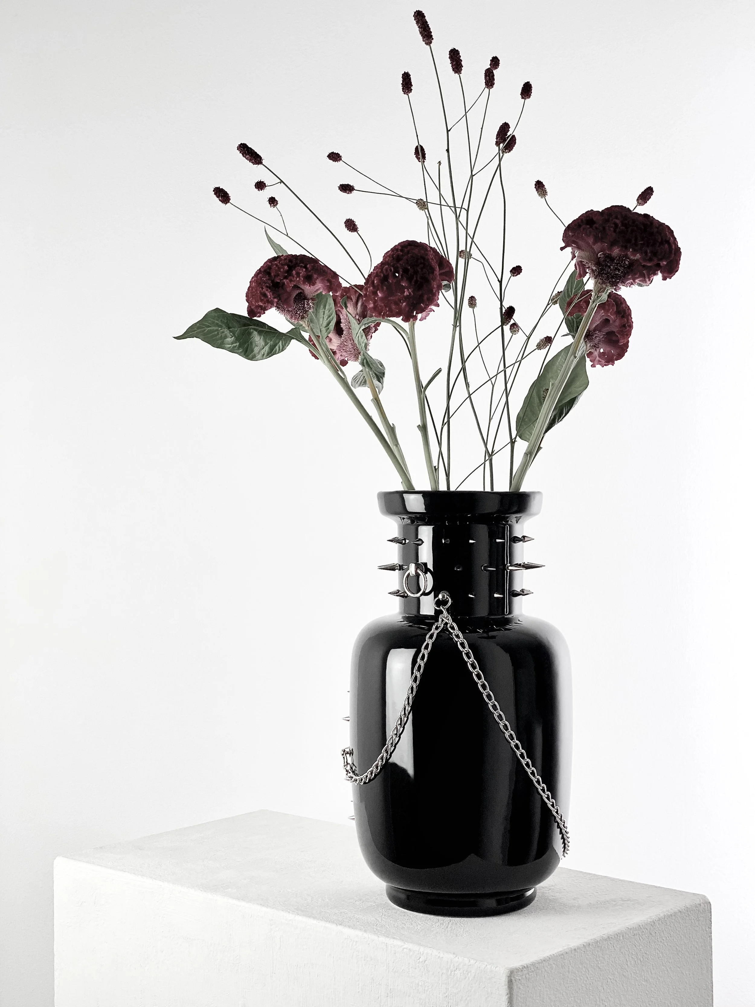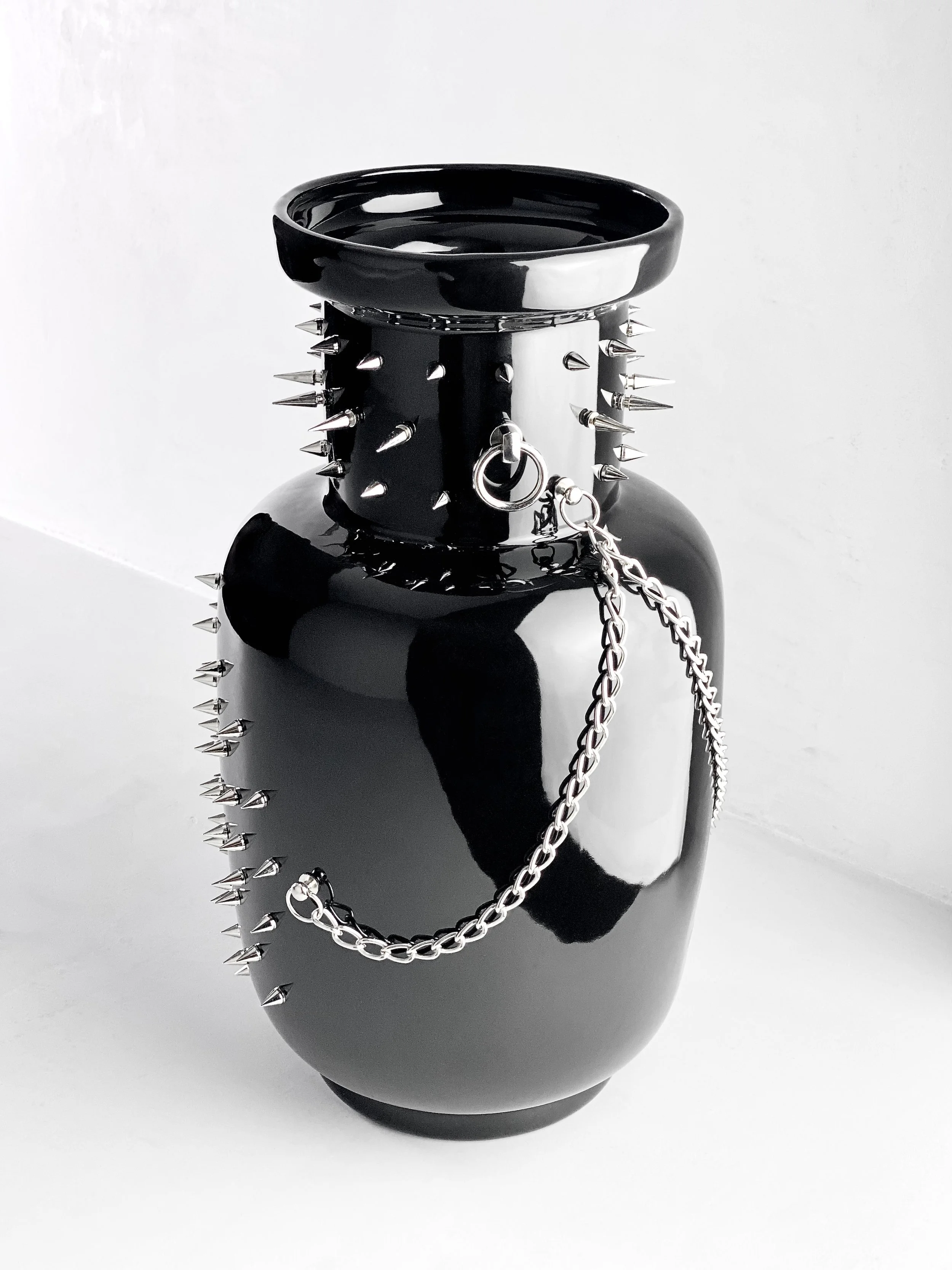 At 38 cm tall, its glossy black curves are pierced with chrome spikes and draped with chains, a collision of traditional craft and raw subcultural energy including BDSM, punk and goth. The result is a sculptural work and world, that blurs the line between art and design, fragility and aggression, beauty and danger.