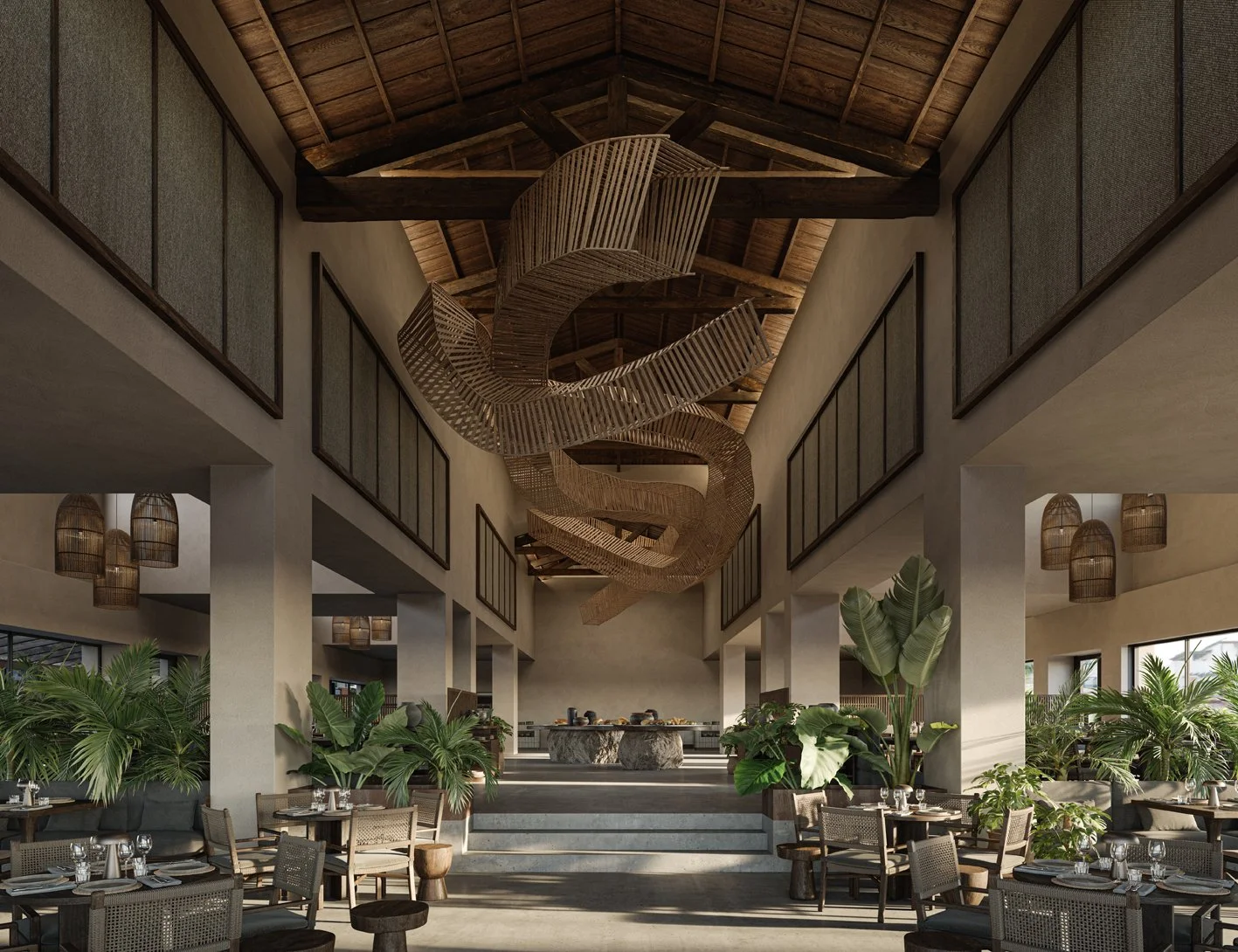 While the architecture whispers rather than shouts, it is rich with intention. Think: floating staircases, indoor-outdoor flow, and artisanal details subtly referencing the textures of Spanish finca life. The adults-only beach club mirrors this restraint, combining breezy cabanas, sculpted lounge areas, and curated music with direct access to the beach for a sense of barefoot elegance.